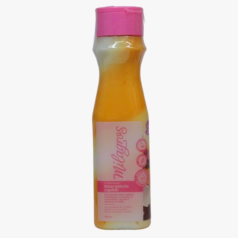 Milagros tratamiento emergencia capilar,es un tratamiento intensivo diseñado para revitalizar, nutrir, y reparar el cabello dañado, su formula ayuda a devolver la suavidad, el brillo y la fuerza del cabello maltratado por procesos químicos, calor, resequedad o daño ambiental. Contenido 400 ml / Is an intensive hair care treatment design to revitalise, nourish, and repair damage hair from the first use, this formula helps to restore , soften, shine, and strength to hair effected by chemical